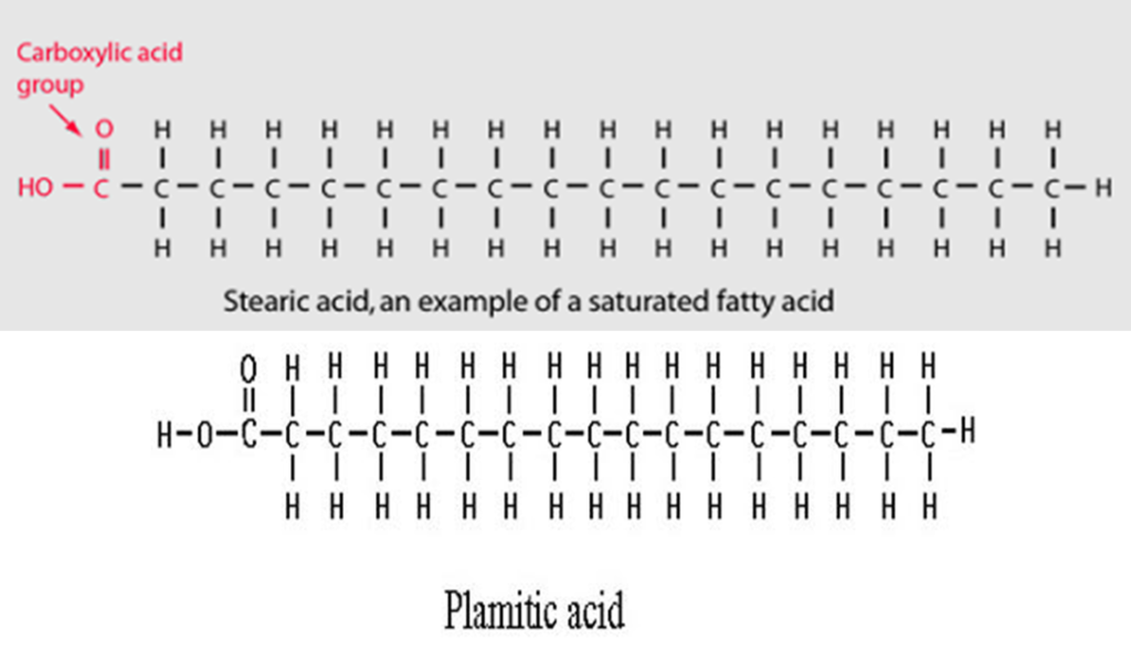Fatty acids are organic acids which are composed of hydrocarbon chain ending in carboxyl group (-COOH). They can be:-