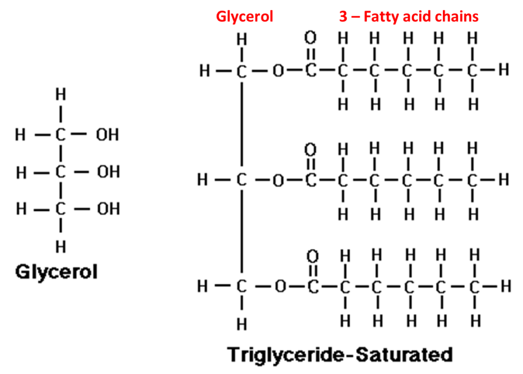 Triglycerides are three molecules of fatty acids and one molecule of glycerol.